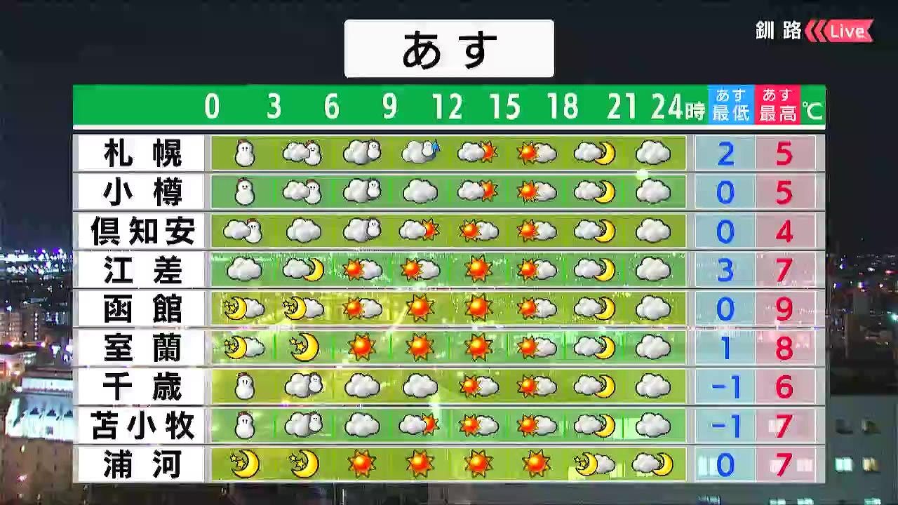 札幌や小樽は昼前まで雪が降り、風も強いでしょう。千歳や苫小牧も明け方まで雪で、うっすら積もりそうです。朝の気温は広く0度前後です。