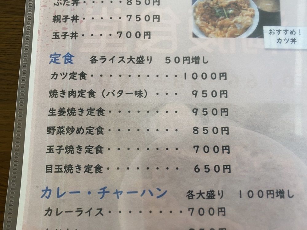 お品書きには、カツ丼など丼物の他にも定食やカレーライス、チャーハンなどの食堂の定番メニューが並んでいます。なおラーメンやそば、うどんなどの麺類もありましたが、6月から休止しているそうです。