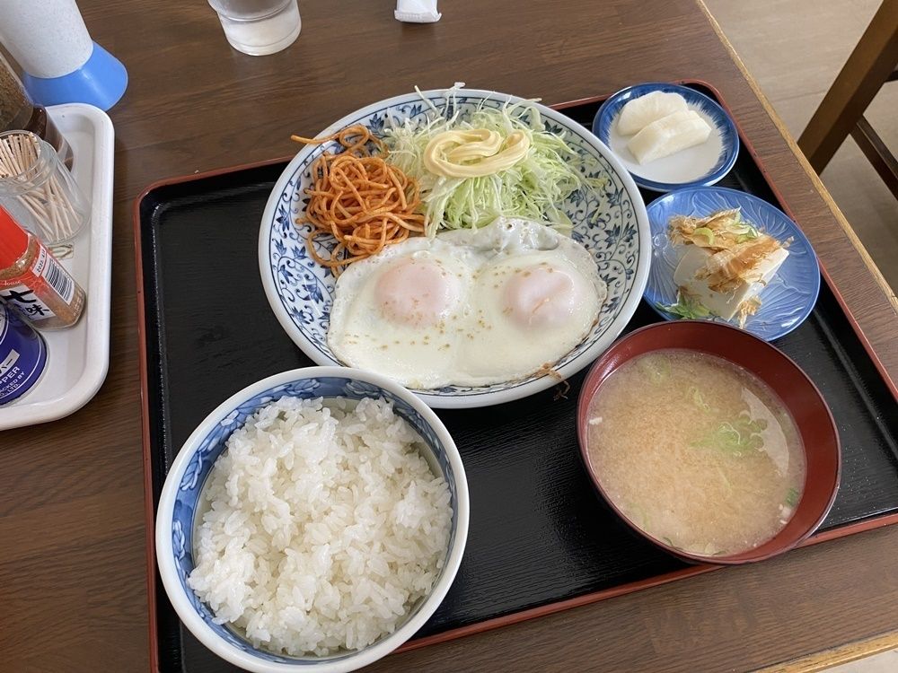 目玉焼きはちょうど良い半熟具合で、箸で割ると黄身がとろりとが出てきます。ごはんにお味噌汁、そして目玉焼きの定食ってシンプルでおいしいですよね。
