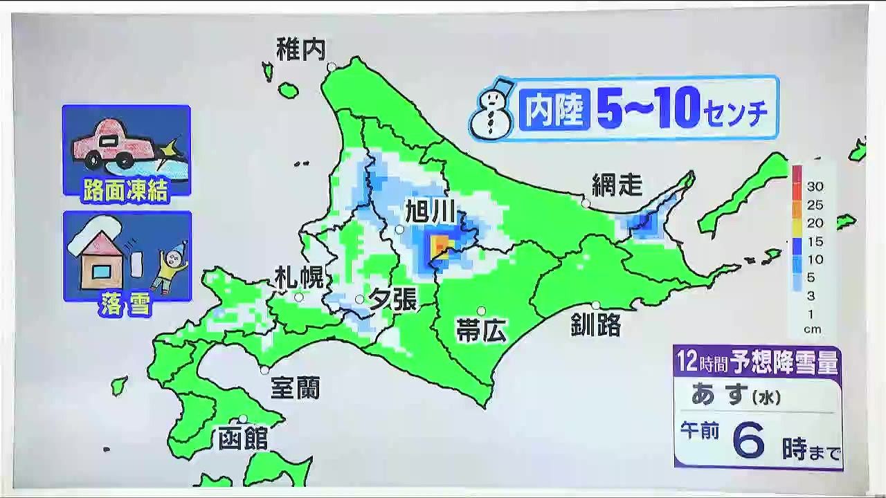 極端な大雪にはなりませんが、日本海側を中心に雪が降るでしょう。あす12日(水)午前6時までの12時間に、上川地方など内陸の多いところでさらに10センチ。夕張周辺の大雪の峠は越えていますが、長沼町や由仁町周辺で5センチくらいの雪が降るでしょう。路面状況の変化や、大雪になった地域では屋根からの落雪にも注意してください。