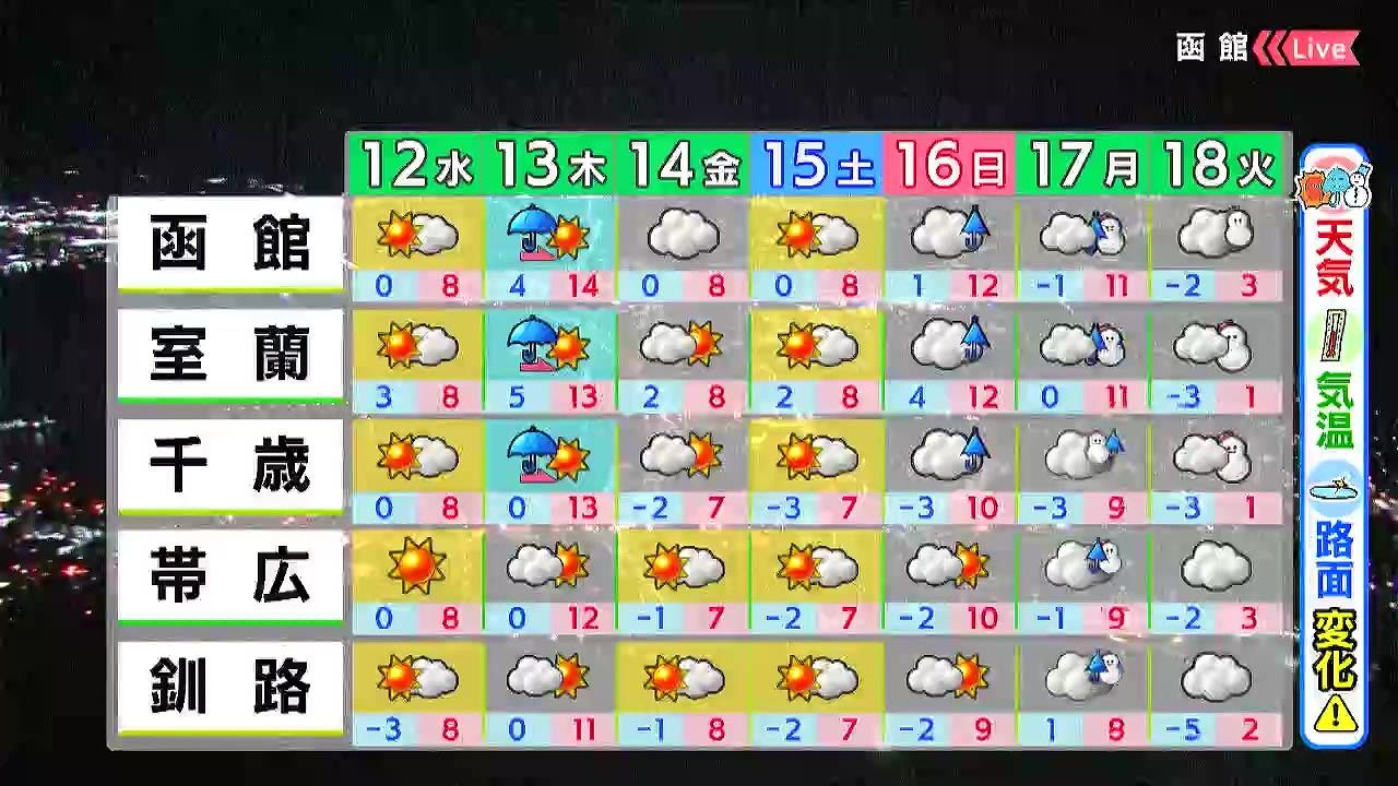 木曜は西部で雨が降りますが、気温は10度を超え、函館は14度でしょう。金曜、土曜は晴れても寒く、日曜の雨の後、来週は道南方面でも雪の積もるおそれがあります。