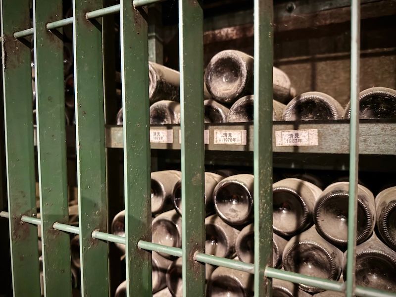 熟成室の壁面には、研究・保存用として過去に作られた十勝ワインが収められています。めっちゃ貴重!