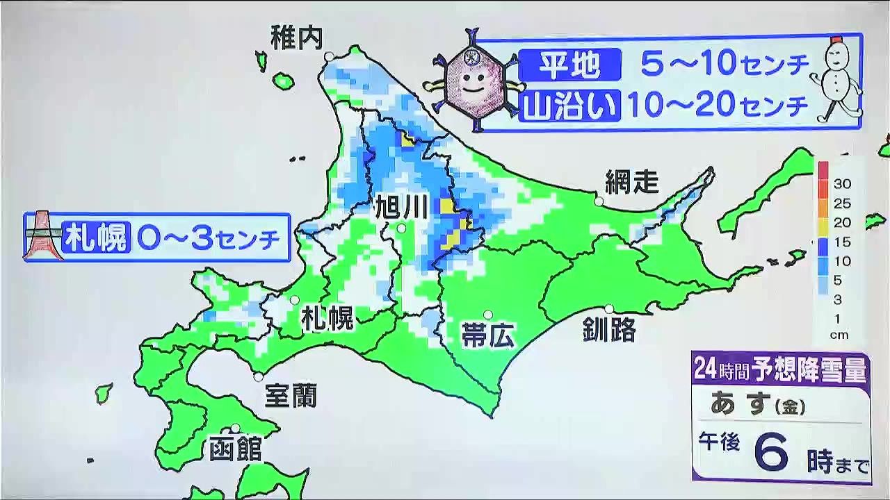 大雪にはなりませんが、上川地方など道北の平地で5~10センチ、山沿いで10~20センチです。札幌でもあす午後は草木がうっすら白くなるでしょう。
