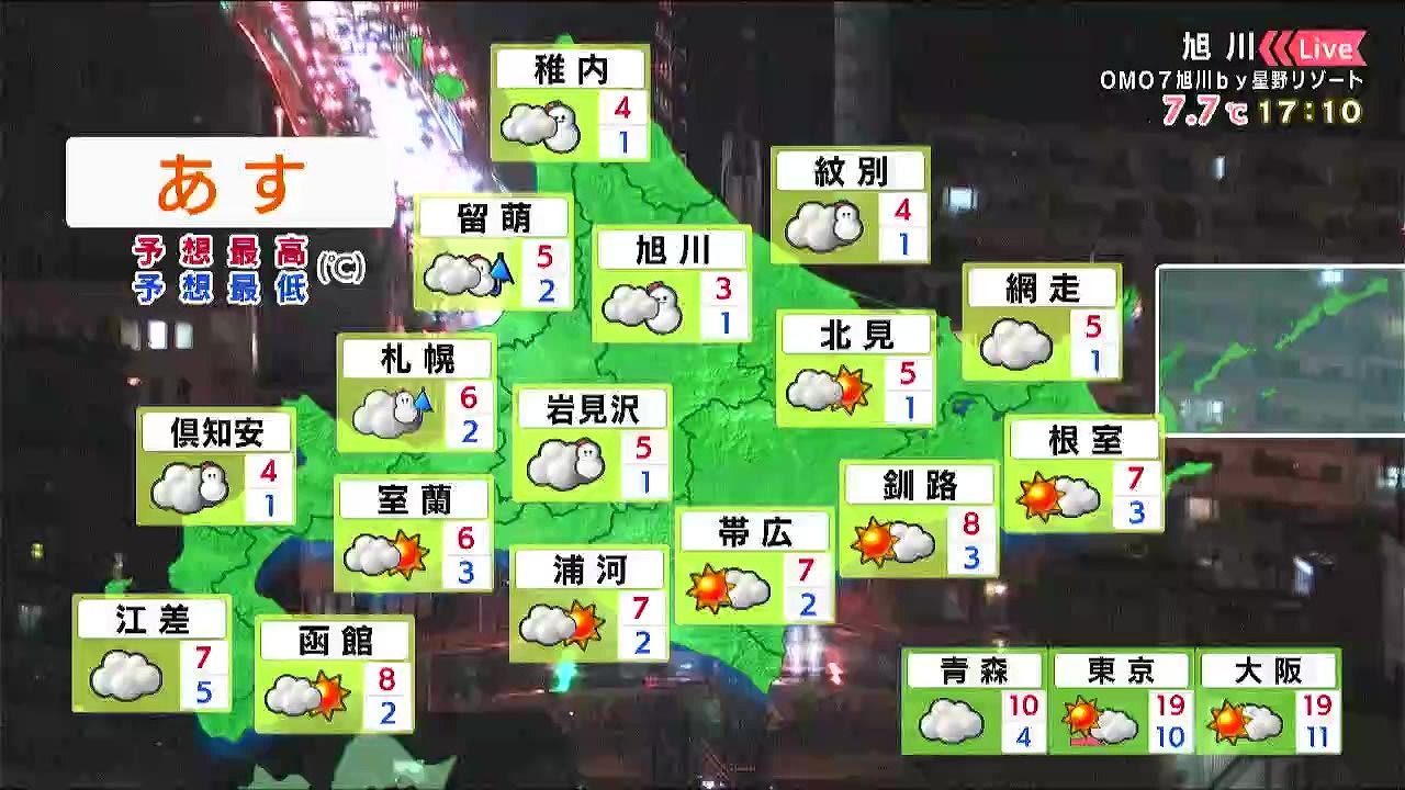 日本海側を中心に雪や雨が降るでしょう。最高気温はきょう13日(木)より大幅に低くなります。きょう13.9度を観測した札幌のあすの予想最高気温は6度です。
