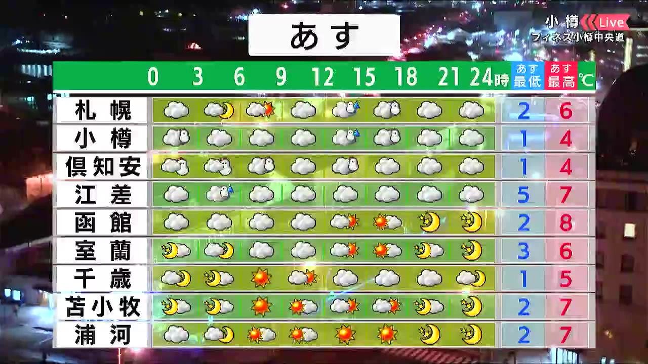 小樽はあす14日(金)のお出かけは厚手の上着と手袋が欠かせませんね。