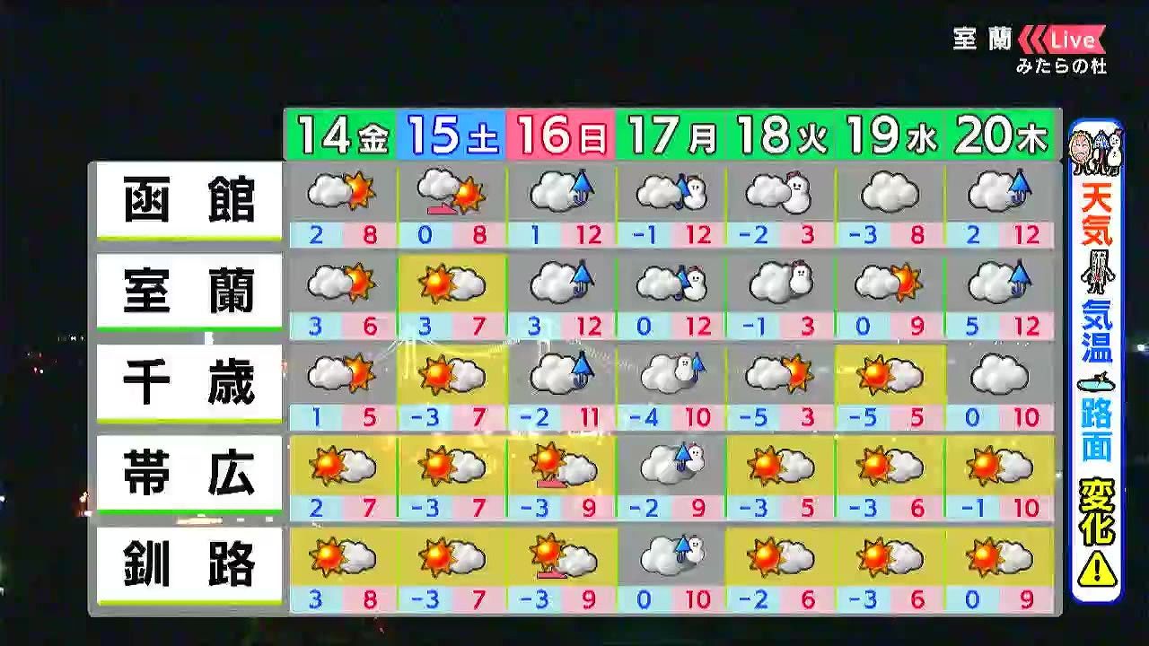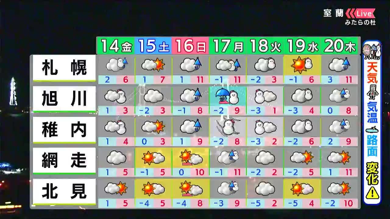 ※13日午後5時時点の情報です。最新の気象情報は、HBCウェザーセンターのホームページなどでご確認ください。HBCは気象庁の認可を2001年に得て以来、民間気象会社の一つとして「HBCの独自予報」を発信しています。