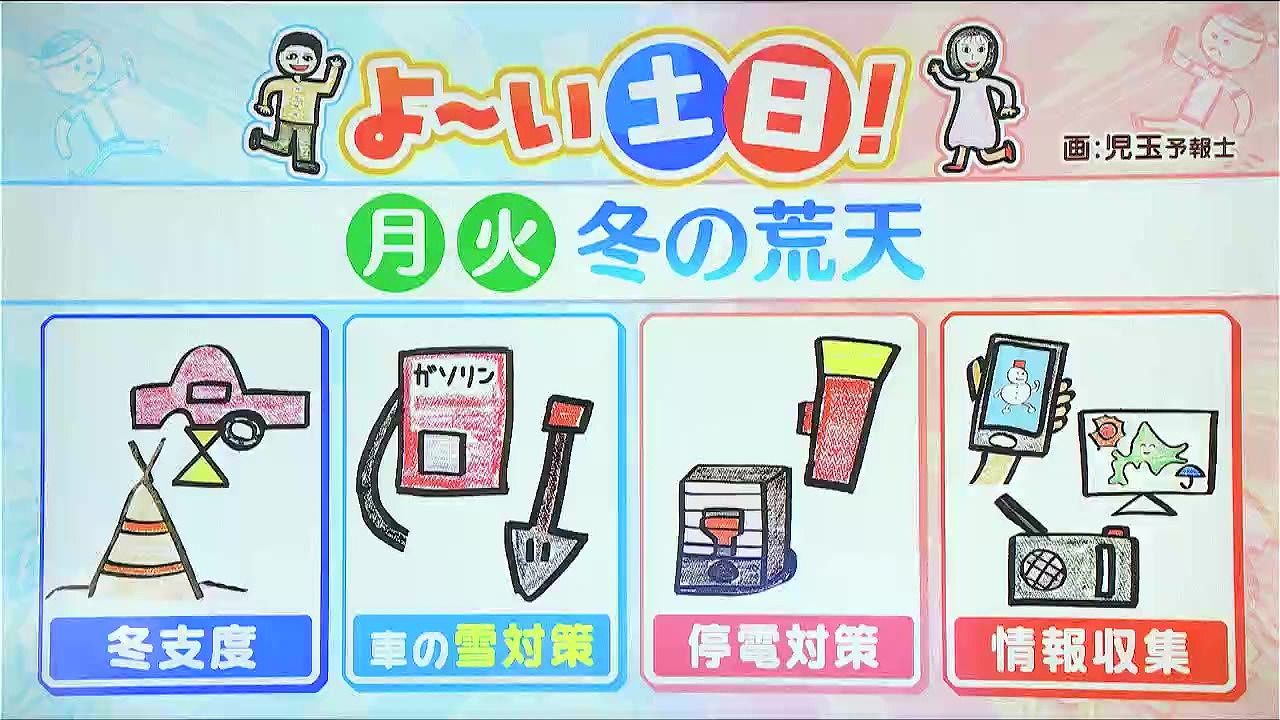 月曜と火曜は冬の荒れた天気で、雪や風が強まります。道南でも雪の積もるおそれがあるので、冬囲いやタイヤ交換など早めの冬支度を、そして、そろそろ車にもスコップを積む、ガソリンを満タンにしておくなど車の雪対策もしましょう。
