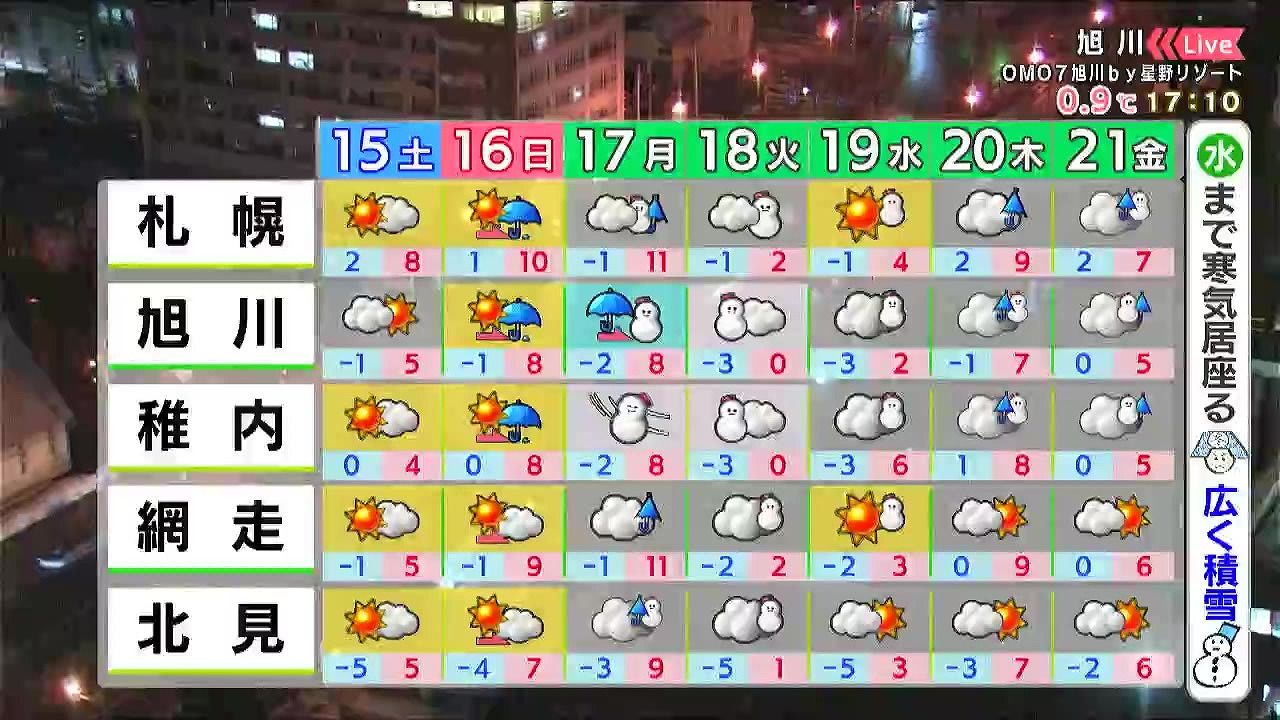 ※14日午後5時時点の情報です。最新の気象情報は、HBCウェザーセンターのホームページなどでご確認ください。HBCは気象庁の認可を2001年に得て以来、民間気象会社の一つとして「HBCの独自予報」を発信しています。