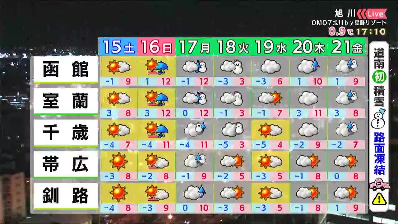日曜の午後は西部で雨、月曜朝は東部でも雨や雪が降ります。月曜午後からは函館や室蘭でも今シーズン初めての積雪になり、水曜にかけて各地で寒さが強まります。