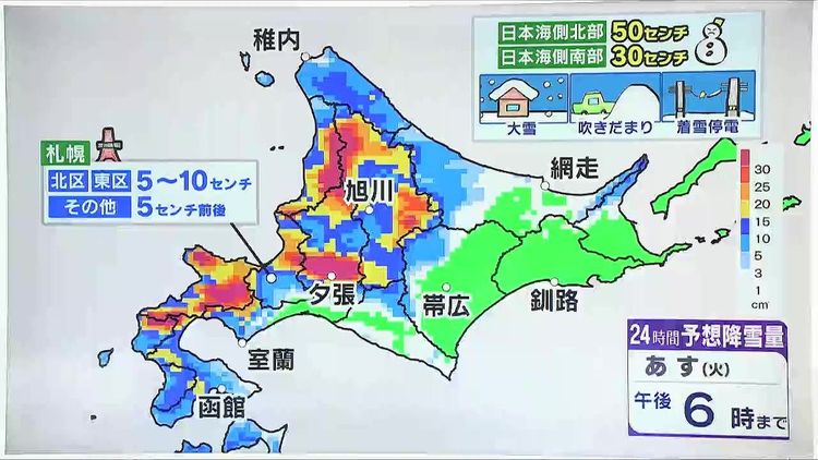 上川北部の幌加内町など日本海側北部の多いところで50センチ、岩見沢から夕張、倶知安方面など日本海側南部は30センチの見込みです。大雪や吹きだまりによる交通障害、着雪による停電にも注意して下さい。