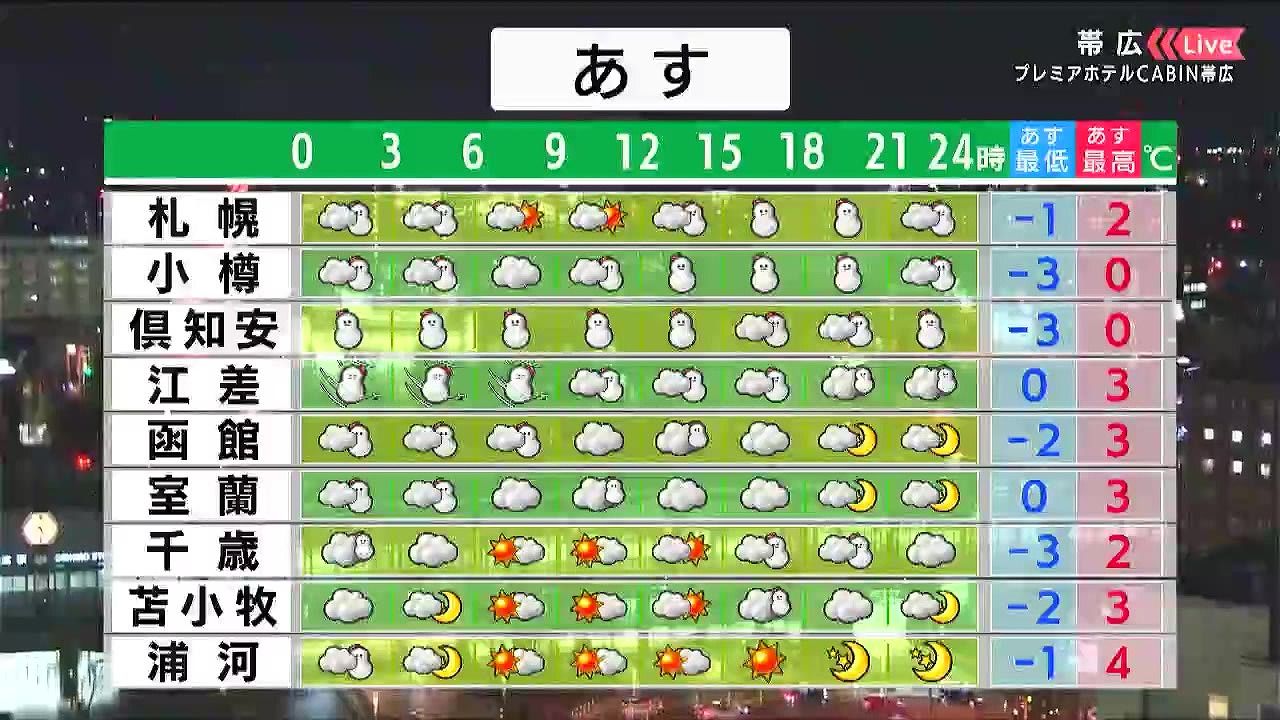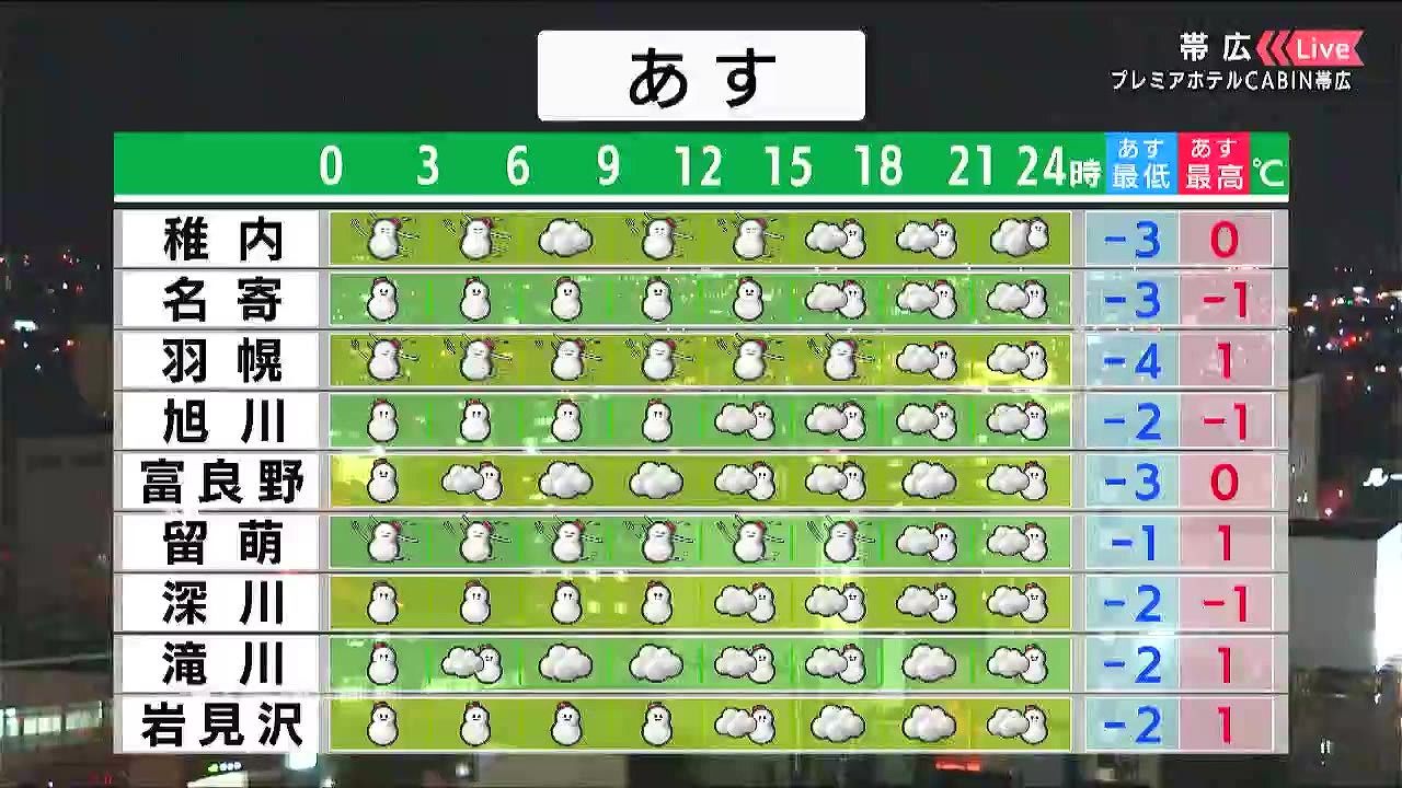 稚内や留萌はふぶくでしょう。名寄や旭川、深川は時折雪が強まり、岩見沢周辺は大雪になるおそれがあります。日中でも気温は0度くらいで、路面の凍結に注意が必要です。