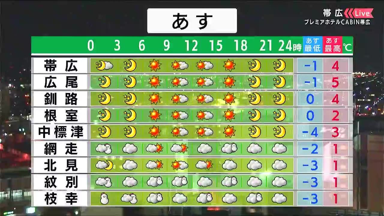 道東は晴れますが、12月並みの寒さです。オホーツク海側は知床半島や紋別、枝幸方面を中心に5センチ前後の雪が降るでしょう。今シーズン初めてやってくる冬将軍は、このまま居座るのでしょうか…。