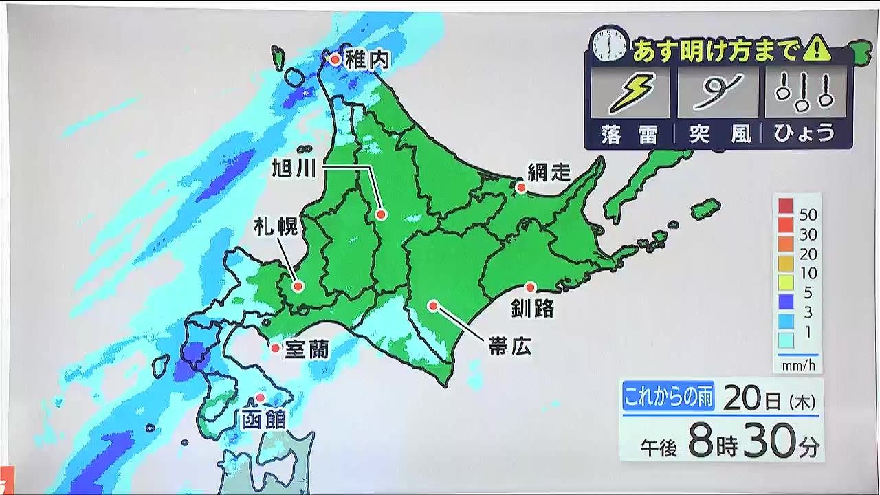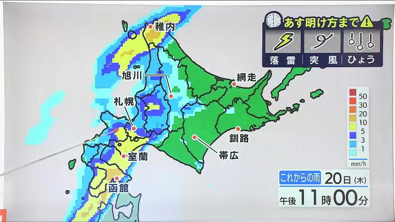 今後の予想です。今夜は道北から雨が強まり、夜9時以降は札幌や道南でも雨が強まるでしょう。