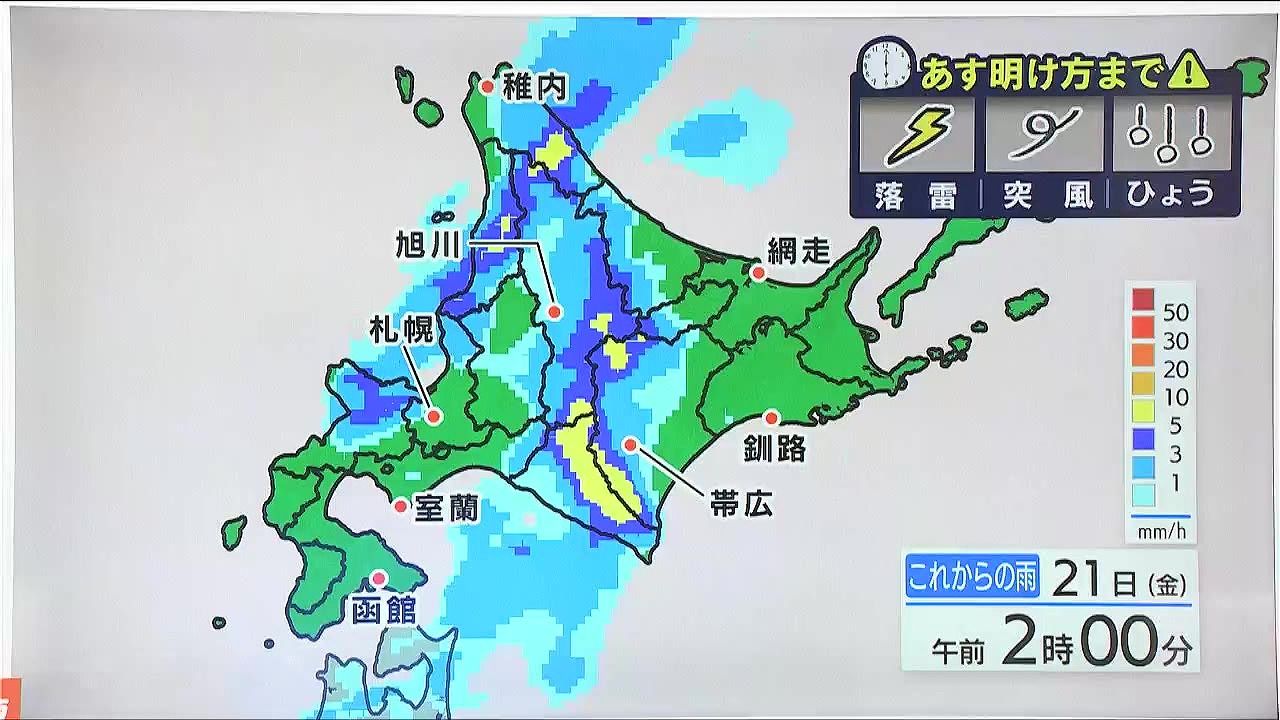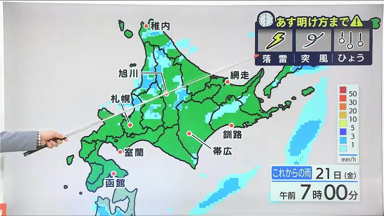 日付が変わると東部でも雨の降る時間があります。大気の状態が不安定になるため、あす21日(金)明け方まで広い範囲で落雷や突風、ひょうなど天気の急変に注意して下さい。