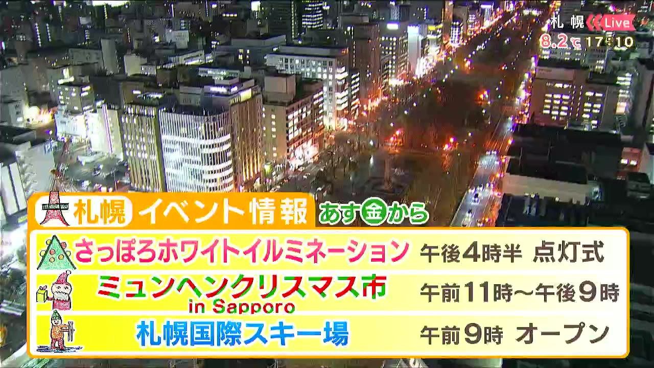あすは午後4時半から点灯式です。大通公園2丁目ではミュンヘンクリスマス市が始まります。札幌国際スキー場はあす21日(金)オープン、一部コースで滑走できます。