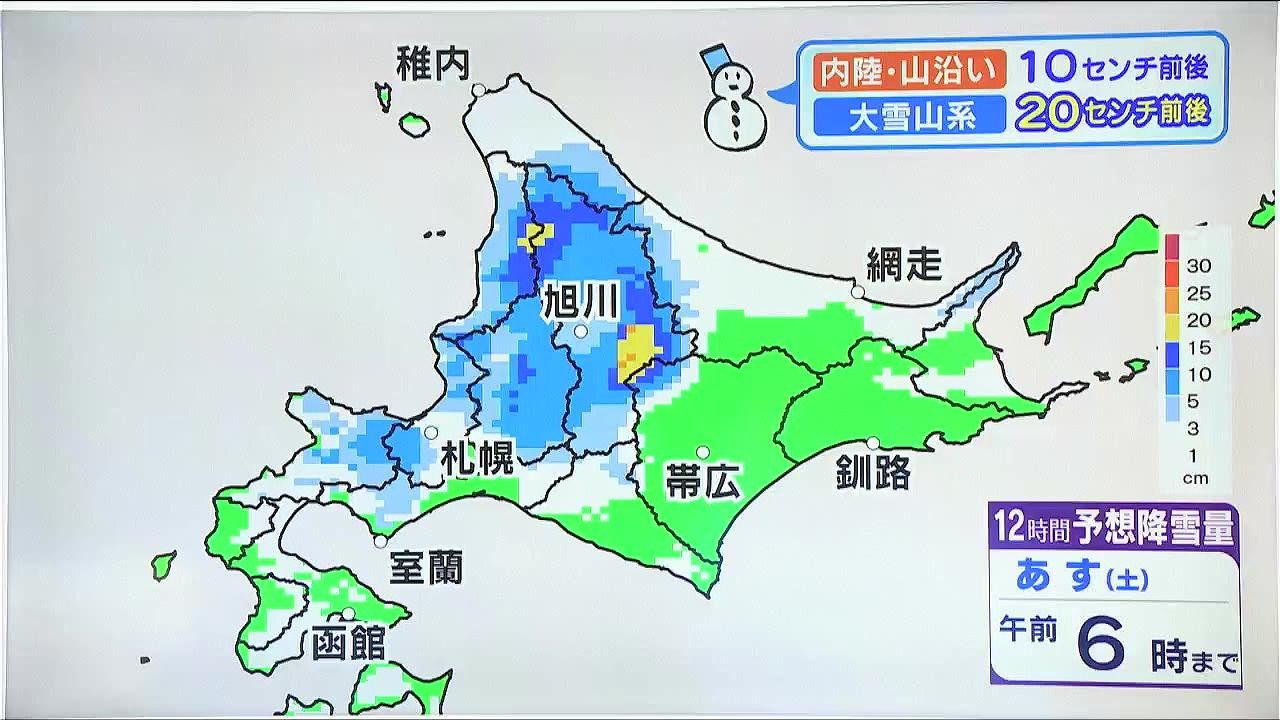 すでに日本海側は雪で、昼頃から旭川で10センチくらい、層雲峡では20センチくらいの雪が降っています。これからあす午前6時までの12時間に、上川や空知地方など内陸や山沿いの多いところでさらに10センチ前後、上川町周辺は20センチ前後の雪が降ります。