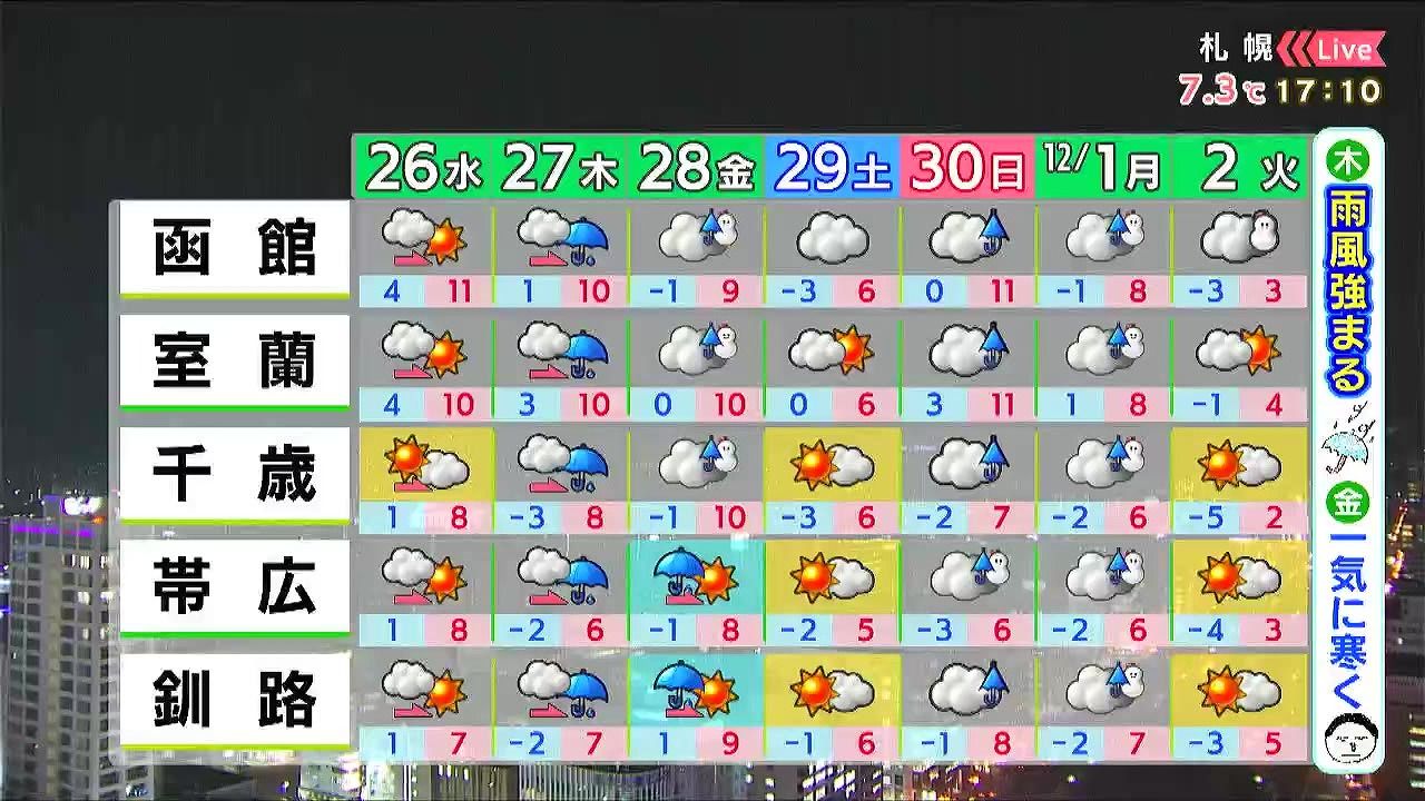 木曜はしだいに雨や風が強まります。金曜は道東で天気が回復しますが、各地で風の強い状態が続き、一気に寒くなるでしょう。その後も晴れ、雨、雪と短い周期で天気が変わります。