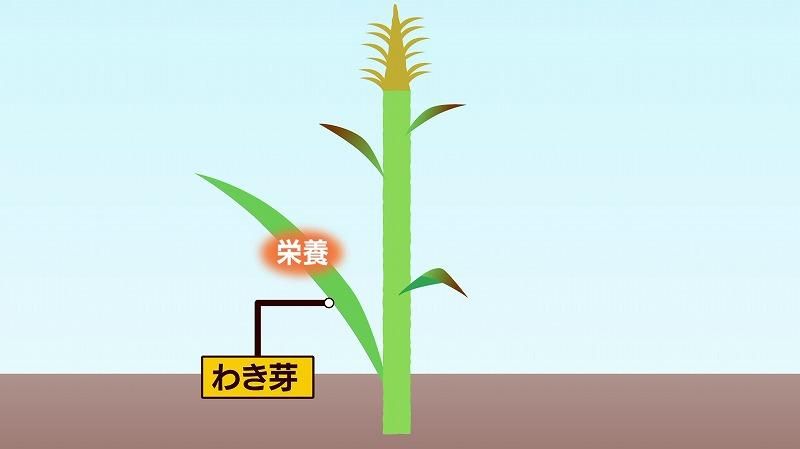 とうもろこしは主茎が真ん中に1本ありますが、成長するに伴って根元近くから枝分かれを始めます。これが「わき芽」です。