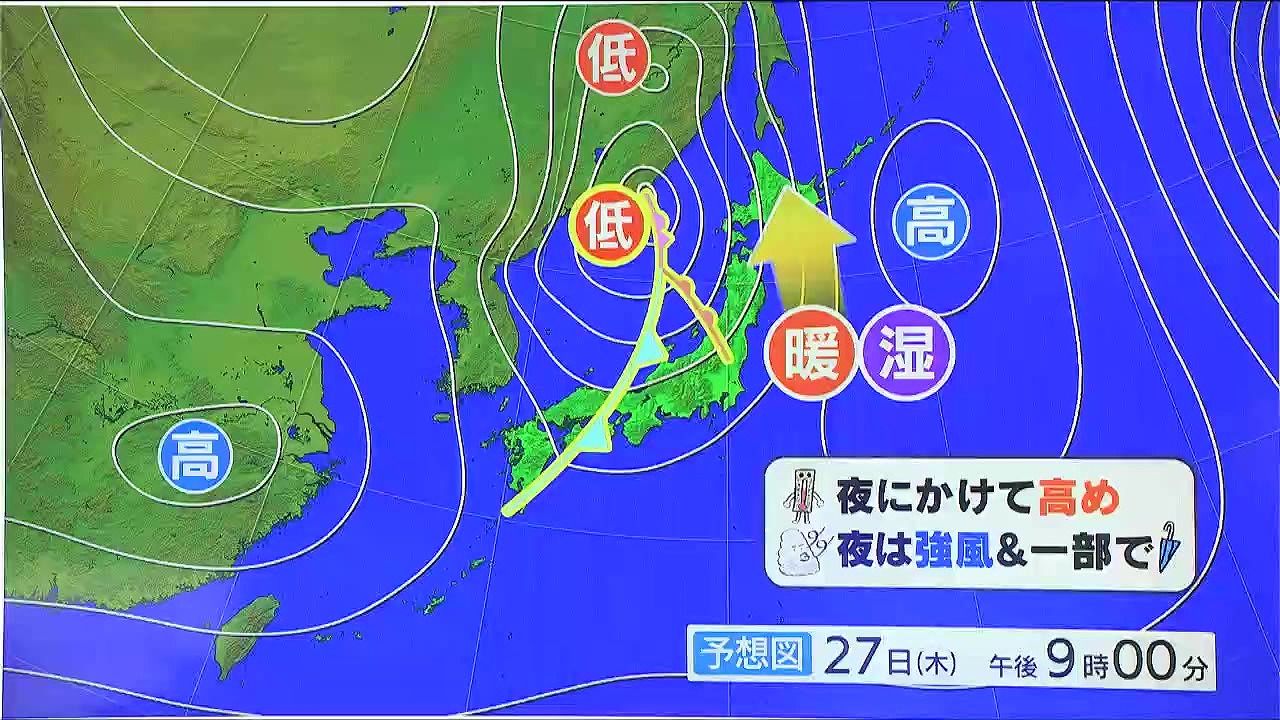 あす27日(木)夜9時の予想天気図で解説します。西から低気圧や前線が近づきます。低気圧の周りは反時計回りに風が吹くため、南風になって暖かい空気が入るため、あすは朝より夜の方が気温が高くなります。