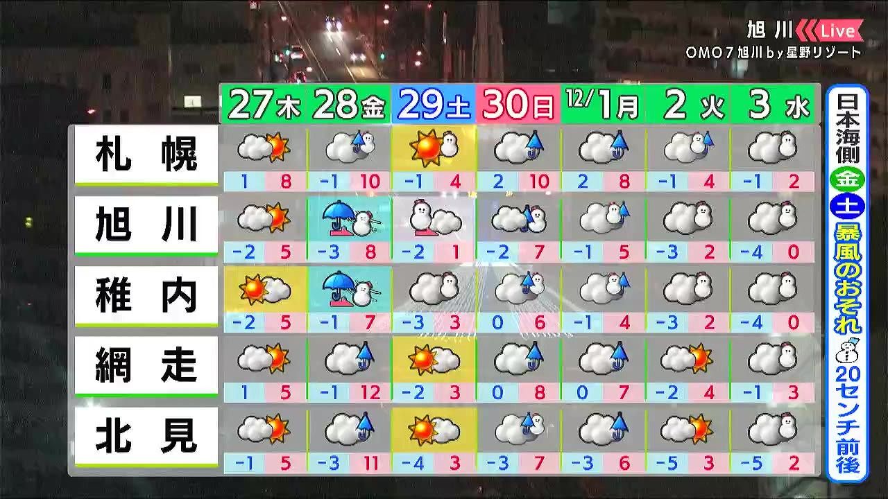金曜から土曜は日本海側を中心に警報級の暴風の吹くおそれがあります。道北の内陸では金曜から土曜にかけて20センチ前後の雪が降りそうです。札幌では荒れる可能性は低いでしょう。