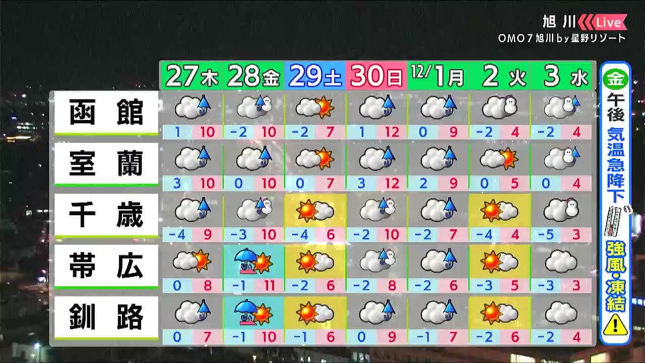 金曜の午前は雨ですが、午後は一気に寒くなり、西部で雪がまじります。金曜から土曜は強風や路面凍結にも注意が必要です。日曜と月曜の雨のあと、来週火曜日以降は寒さが続くでしょう。