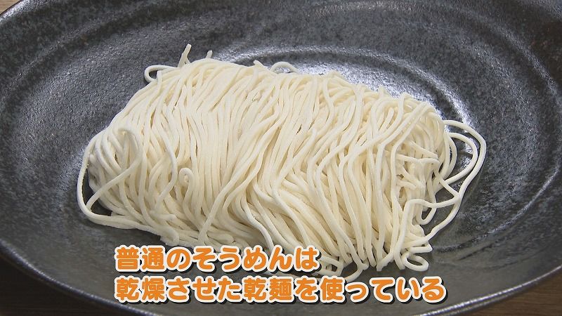 店主 大村さん:「普通のソーメンは乾燥させた乾麺を使っているんですけども、ウチの生ソーメンは生の麺を製麺屋さんに作ってもらっている。モチモチとした食感で、小麦の香りもする。熱くしてしまうとコシやモチモチ感が少なくなるので 『ぬるめ』で」