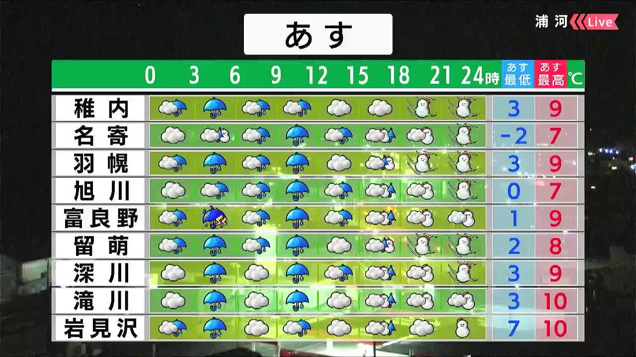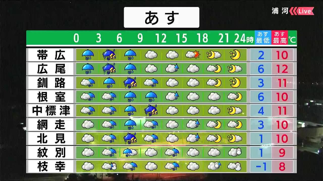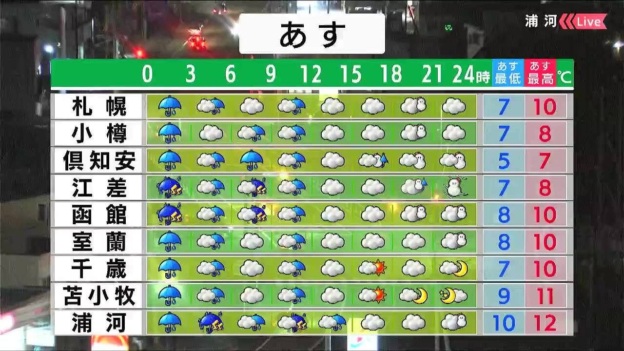 昼頃まで雨が降るでしょう。雷の音が聞こえたら、頑丈な建物に移動してください。夜は札幌など広い範囲で湿った雪が降り、後志地方や山沿いでうっすら積もるでしょう。