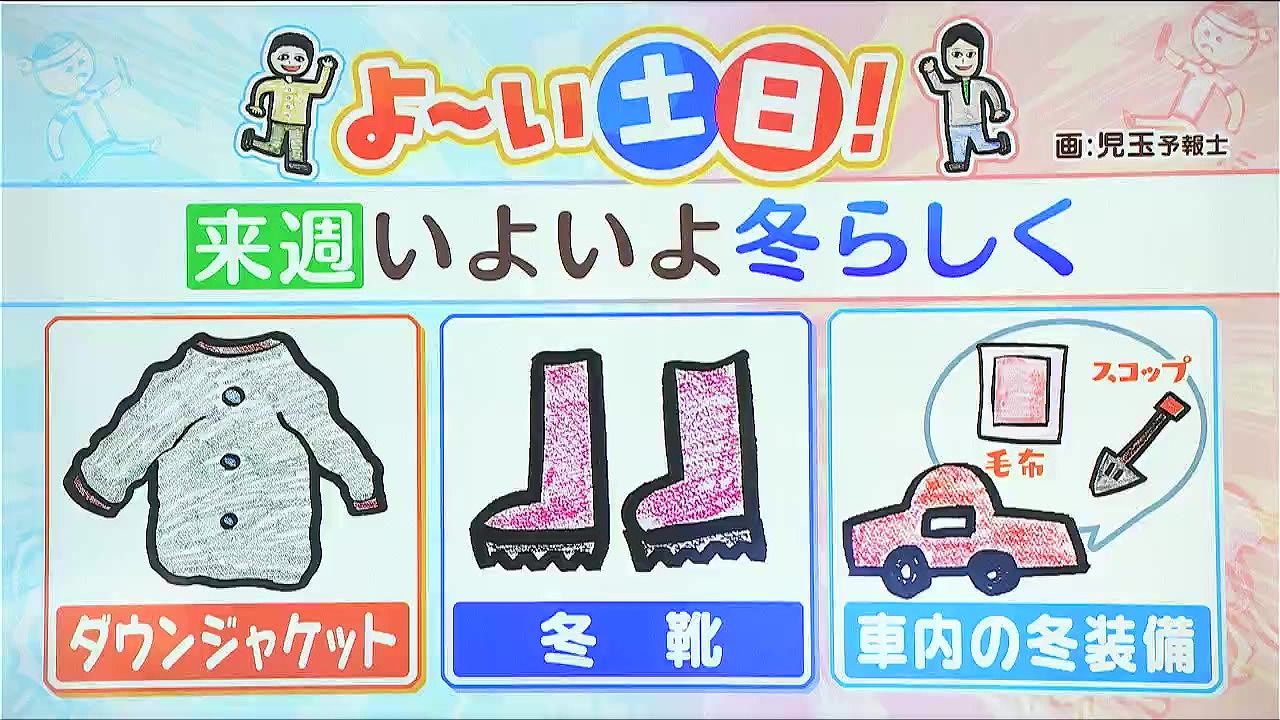 来週は冬将軍が長く居座り冬らしくなりそうです。ダウンジャケットや冬靴、車には雪による立往生に備えてスコップや暖をとれる毛布などの冬装備をしておきましょう。