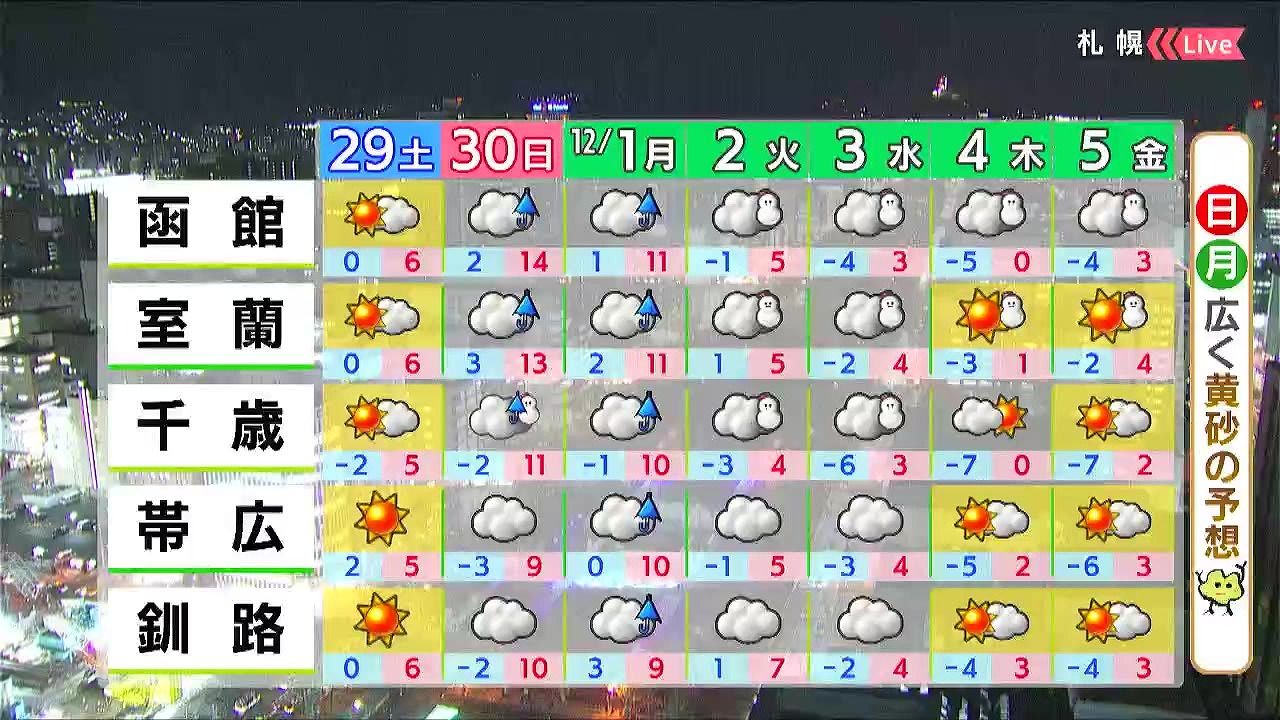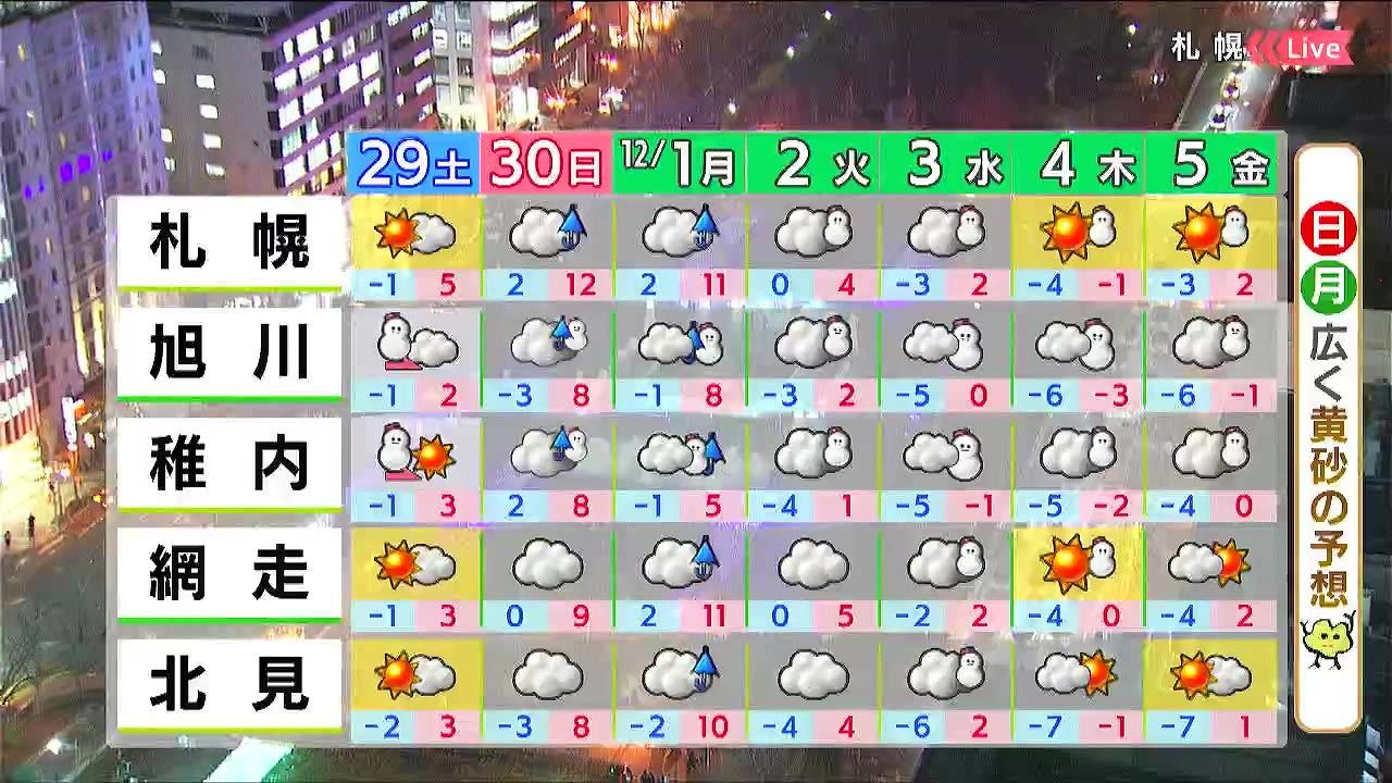 日曜の午前と、月曜の午後は雨や雪が降ります。日曜と月曜は黄砂も予想されます。火曜日から道北を中心に連日雪が降り、根雪になるところが多くなりそうです。