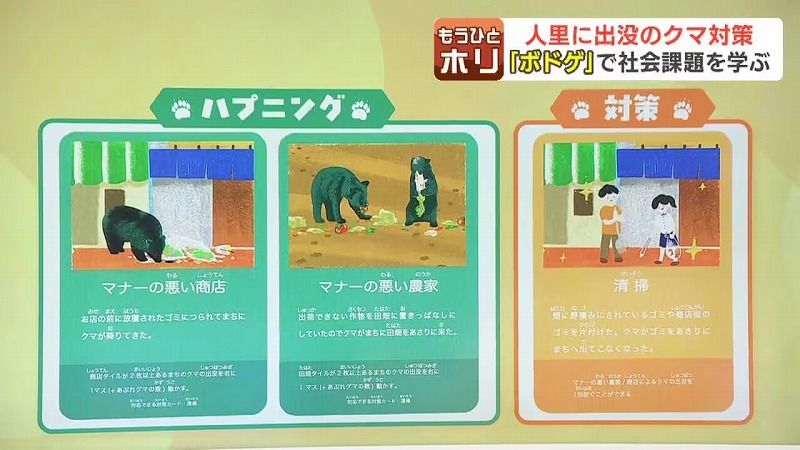 ハプニングが描かれたカードがあり、店の前にゴミを放置する「マナーの悪い商店」や、出荷できない作物を畑に置きっぱなしにする「マナーの悪い農家」などのカードが出た場合は、その対策として「清掃」のカードを使って、クマが人里に出没する原因や対策を学びます。