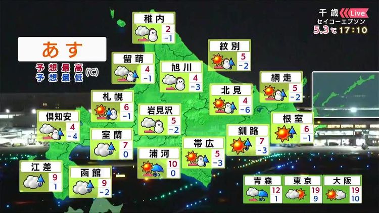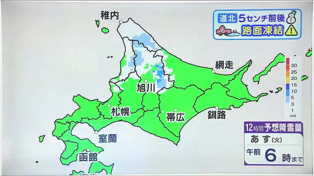 雪の量は多くはなりません。あす2日(火)午前6時までの12時間に降る雪の量は、道北で5センチ前後ですが、うっすら白くなった路面の凍結に注意が必要です。