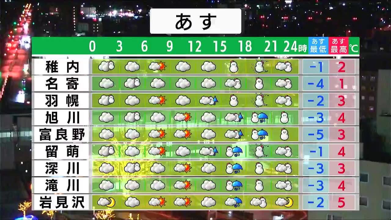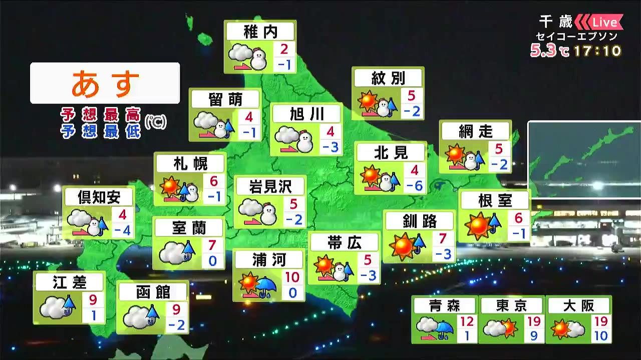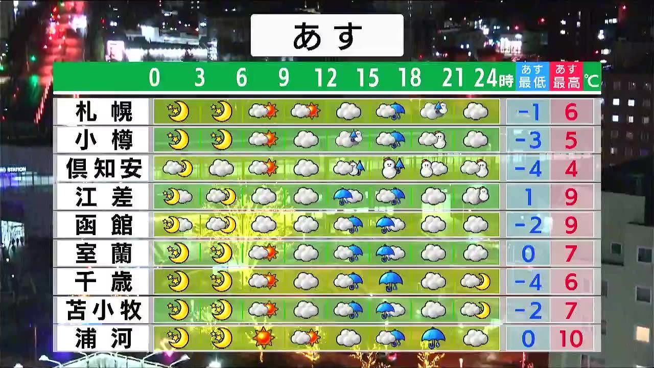 朝は穏やかでも傘が必要です。昼過ぎから夕方は雨や雪が降り、道南方面を中心に雷を伴うでしょう。夜は倶知安方面でうっすら雪が積もりそうです。