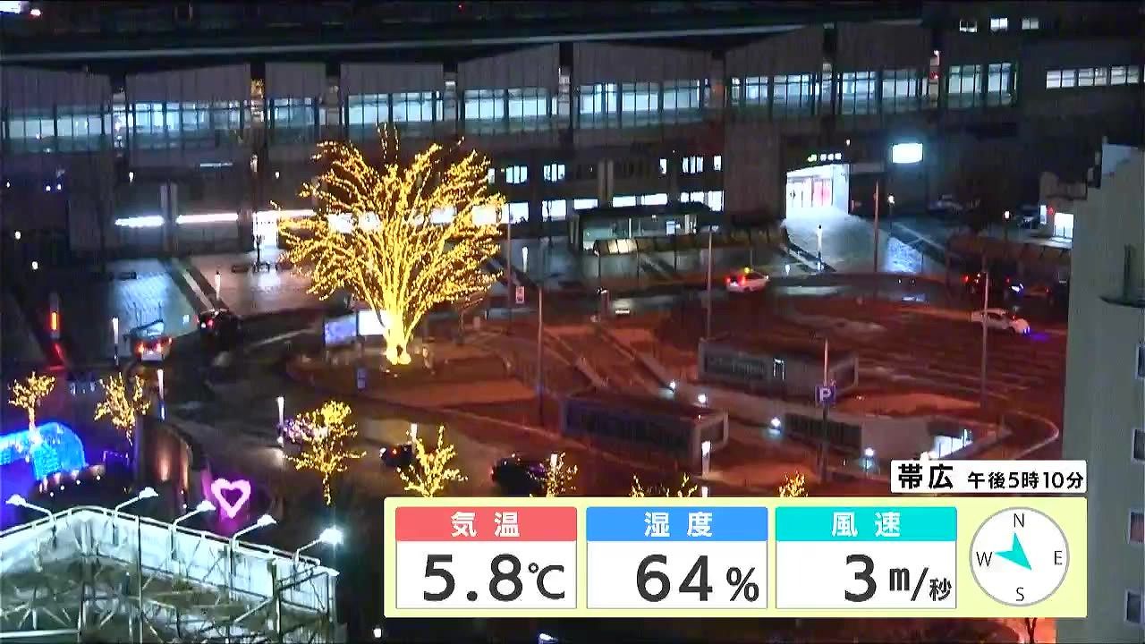 帯広です。おととい土曜日から始まった「おびひろイルミネーションプロジェクト」。きれいですね。ただ、十勝平野ではきょう1日(月)、冷たい空気がとどまって、最高気温でも5度くらいと、寒くなりました。あす2日(火)もしっかり防寒をしてお出かけ下さい。