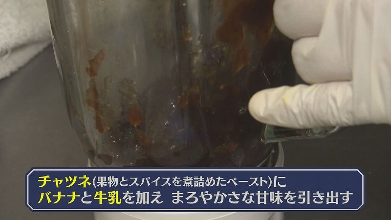 さらに、果物とスパイスを煮詰めた甘酸っぱい味覚の調味料チャツネを加えたあと、バナナと牛乳でまとめ、まろやかさな甘味を引き出していきます。