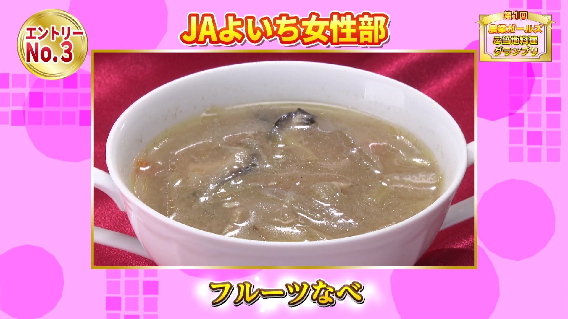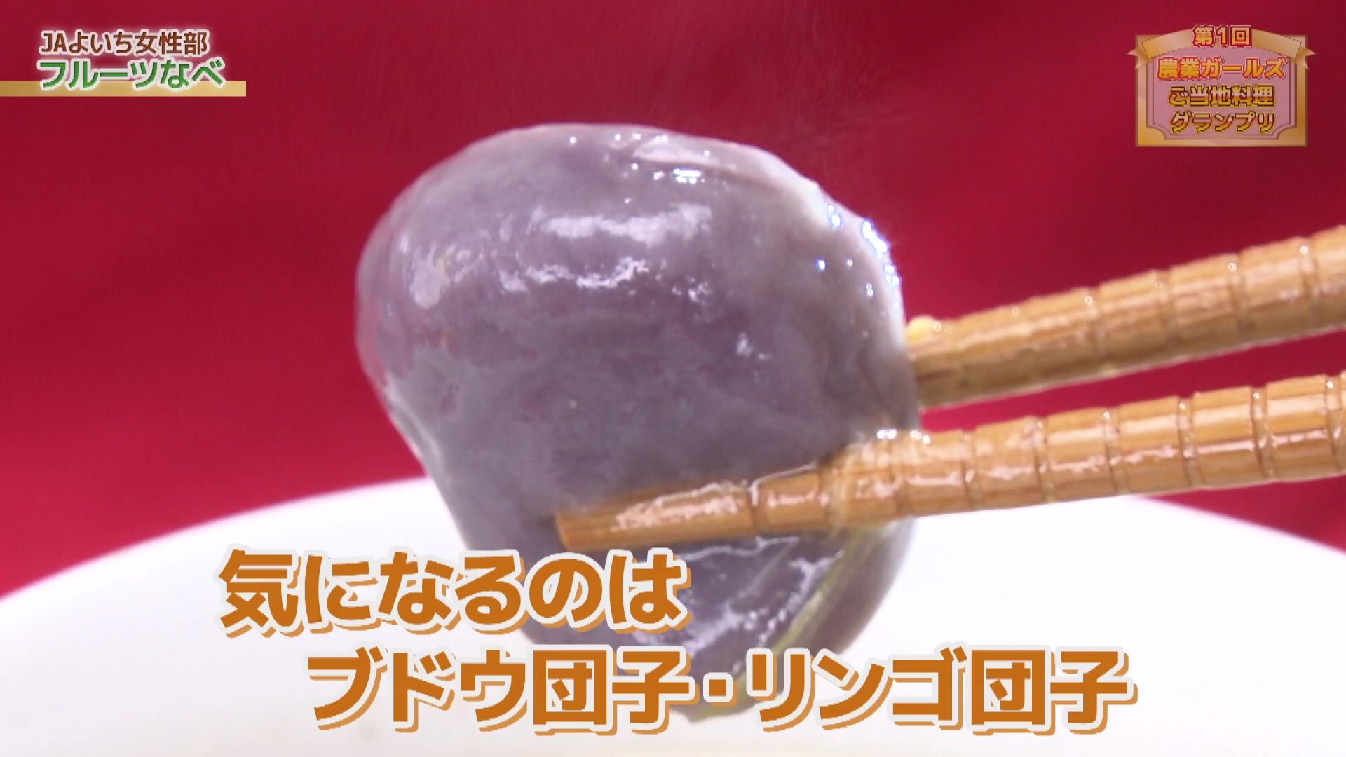 JAよいち女性部考案のオリジナルレシピです。昆布や干ししいたけの出汁と野菜と鶏肉のうまみを引き出したスープに千両梨の甘味と食感を加え、3色の団子にはぶどう・りんご・かぼちゃを練りこみ彩りと食材由来の自然の甘さを加えた1品です。