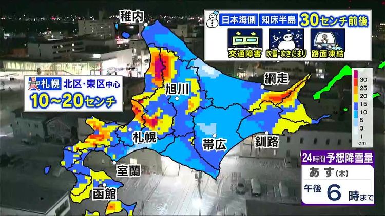 全道的に雪が降り、道東でもこの冬初めての積雪となりそうです。赤や紫のエリア、上川北部の幌加内町周辺や、岩見沢、倶知安町、知床半島周辺の多いところで30センチ前後です。大雪や吹雪、吹きだまりによる交通障害、路面凍結にも注意してください。札幌も北区、東区を中心に10~20センチの雪が降るでしょう。