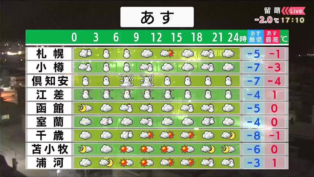 日本海側や道南で大雪や吹雪となるおそれがあります。今シーズン一番の寒さで最低気温は‐5度前後、最高気温も広くマイナスの真冬日です。