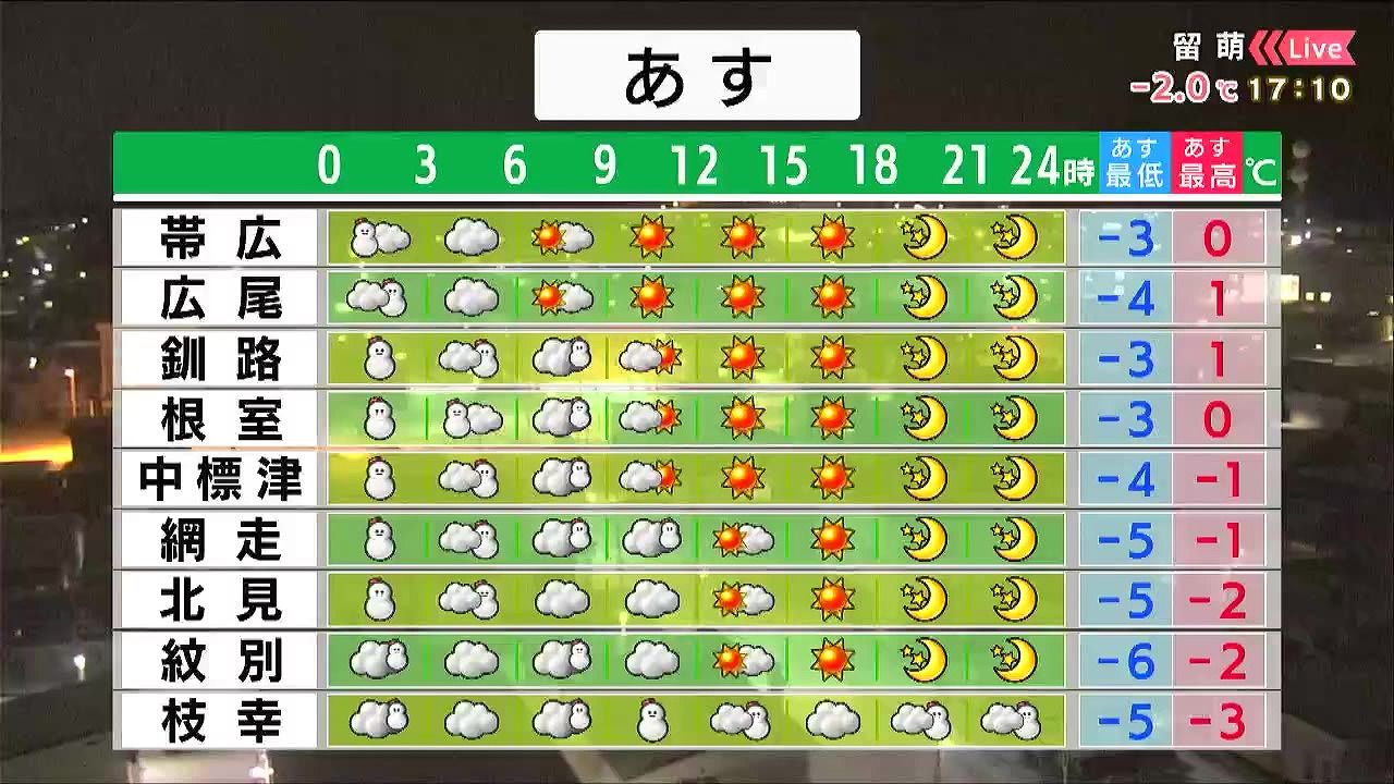 朝は広く雪が積もるでしょう。ツルツル路面に注意して下さい。日中はしだいに晴れますが、道北の枝幸は雪が降りやすいでしょう。