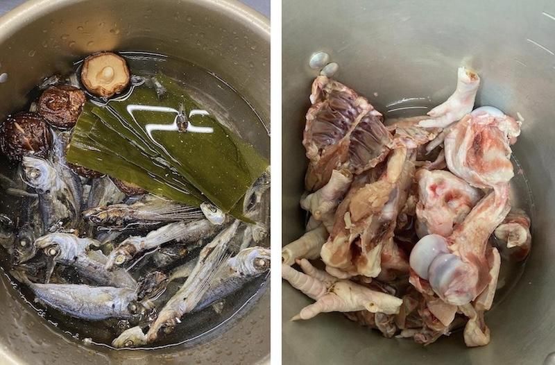 前者は数種の野菜に昆布、干し椎茸、カツオ節、アゴの焼き干し、本枯れサバの厚削りなどを煮込んだスープ。後者は鶏ガラ、ゲンコツ、モミジなどを煮込んだスープ。