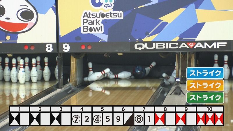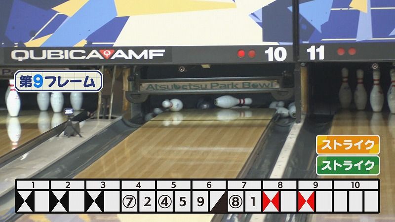 さらには第9フレームまで連続ストライク!