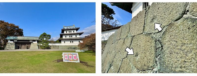 現在の松前城の天守は再建されたものですが、国の重要文化財にも指定されている本丸御門や、天守を支えている石垣は築城当時から残る遺構として時の流れを伝えてくれます。観光中、石垣に丸い窪みを発見したので 「もしや……」と思って後で調べてみたところ、やはり箱館戦争時の砲撃跡だったようです。