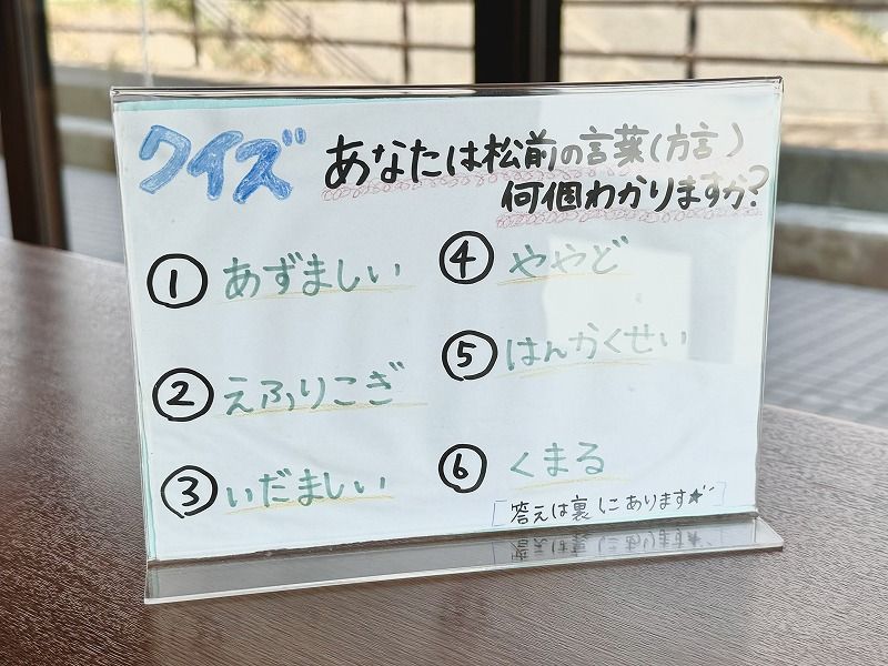 出かける最後に、のりだんだんの到着を待っている間、テーブルの上に置いてあって目に留まった「松前の方言クイズ」を読者の皆さまにも共有して終わります。いくつ分かりますか……?