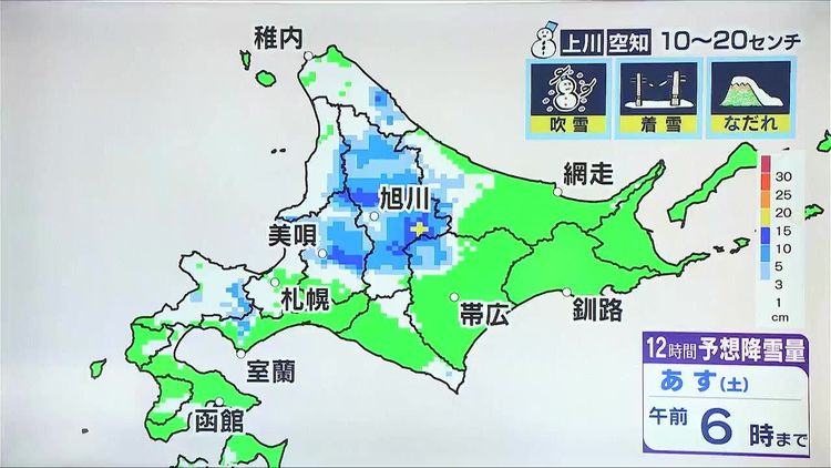 今夜にかけても寒気が居座ります。あす6日(土)朝6時までの12時間に降る雪の量は、上川の幌加内町や層雲峡周辺、空知の滝川から美唄周辺でさらに10~20センチでしょう。吹雪や着雪、なだれにも注意が必要です。札幌は雪の量は少ないでしょう。