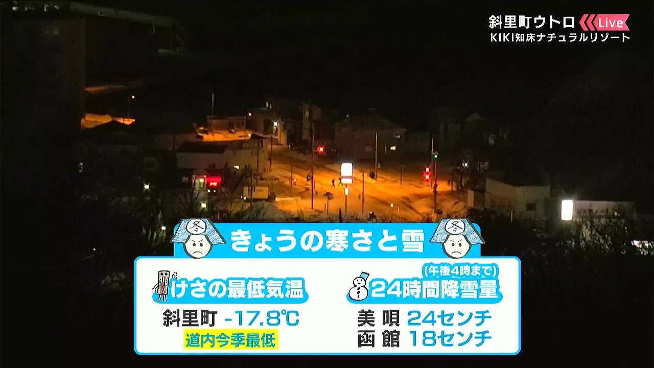 上空に居座る寒気の影響で、放射冷却が強まり、斜里町では道内の今シーズン最低となる-17.8度まで気温が下がりました。ここまで下がると、空気中の水蒸気が凍って、太陽の光に反射してキラキラ光るダイヤモンドダストが見られるような冷え込みです。