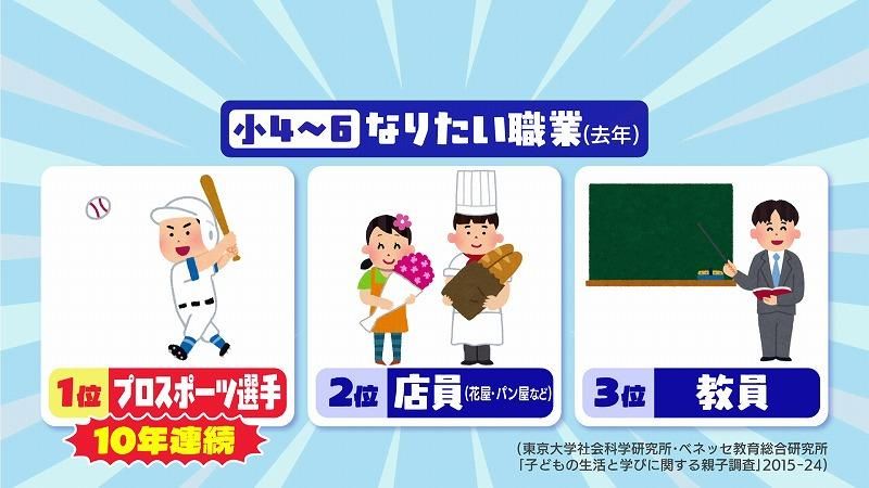 ベネッセ教育総合研究所と東大社会科学研究所が共同で行った調査では、2024年の小学校高学年でのなりたい職業トップ3は以下の通りでした。