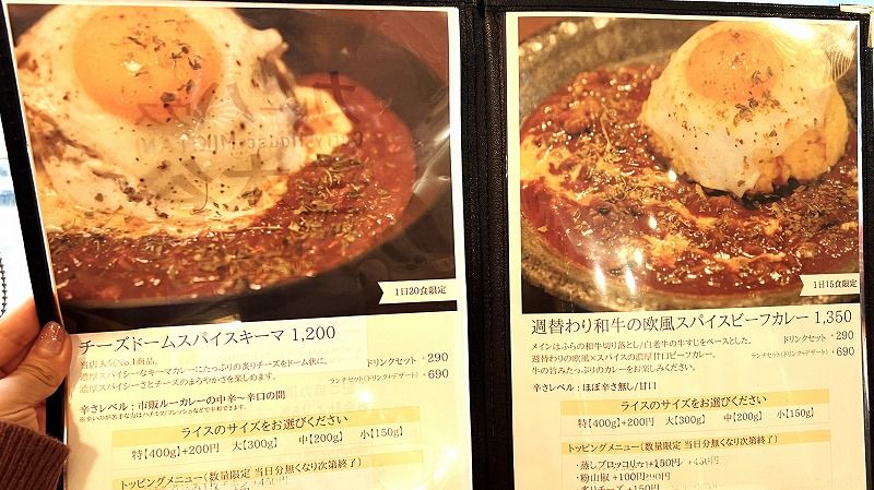 こちらのカレーは、人気No.1の“チーズドームスパイスキーマ”(1200円)と、“週替わり 和牛の欧風スパイスビーフカレー”(1350円)の2枚看板!
