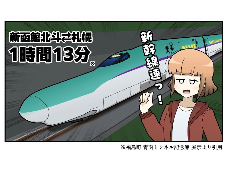 青函トンネルには北海道新幹線の札幌延伸にともなう高速化や、自動車・貨物専用の新たなトンネルを作る「第二青函トンネル構想」といった未来の話題も盛りだくさんです。新幹線の札幌延伸に関しては、全線が開通すると函館北斗~札幌間を1時間ちょっとで移動できるようになるそうで、札幌圏と道南方面の陸路移動に革命がおこります。ちょっと想像できない速さですね……(汗