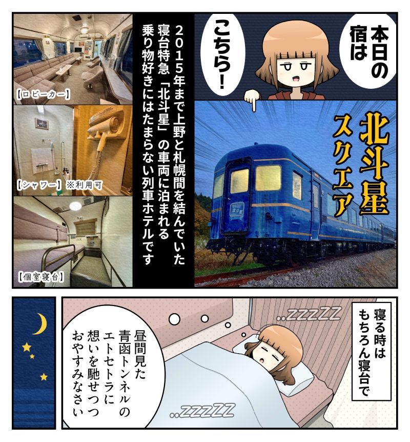 今回のほっかいドライブ本編内で宿泊した、北斗市(もへじ)にある「北斗星スクエア」という宿は、実際に使われていた寝台特急の客車を改造した列車ホテルです。青函トンネル関連の観光とセットで味わうと、旅情マシマシです。