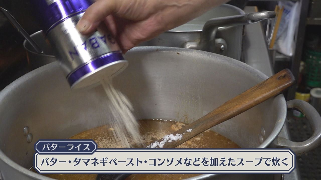 バターライスは、バター、玉ねぎペースト、ローリエとコンソメなどの調味料を加えたスープで炊き上げます。