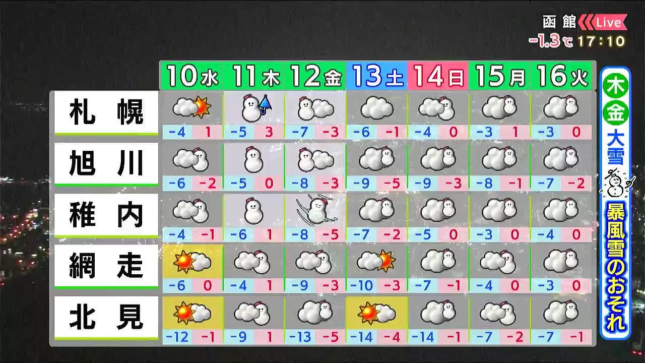 木曜から金曜は日本海側を中心に雪や風が強まります。札幌でも木曜午後からふぶいて、金曜にかけて雪の量が多くなるおそれがあります。また、週末は各地で真冬並みの厳しい寒さになるでしょう。